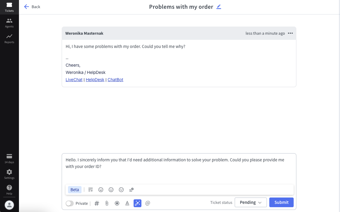 You probably spend almost half of your time on a ticket, using the message area to talk to your recipients. Now you can use AI text enhancements to make the replying process more efficient.