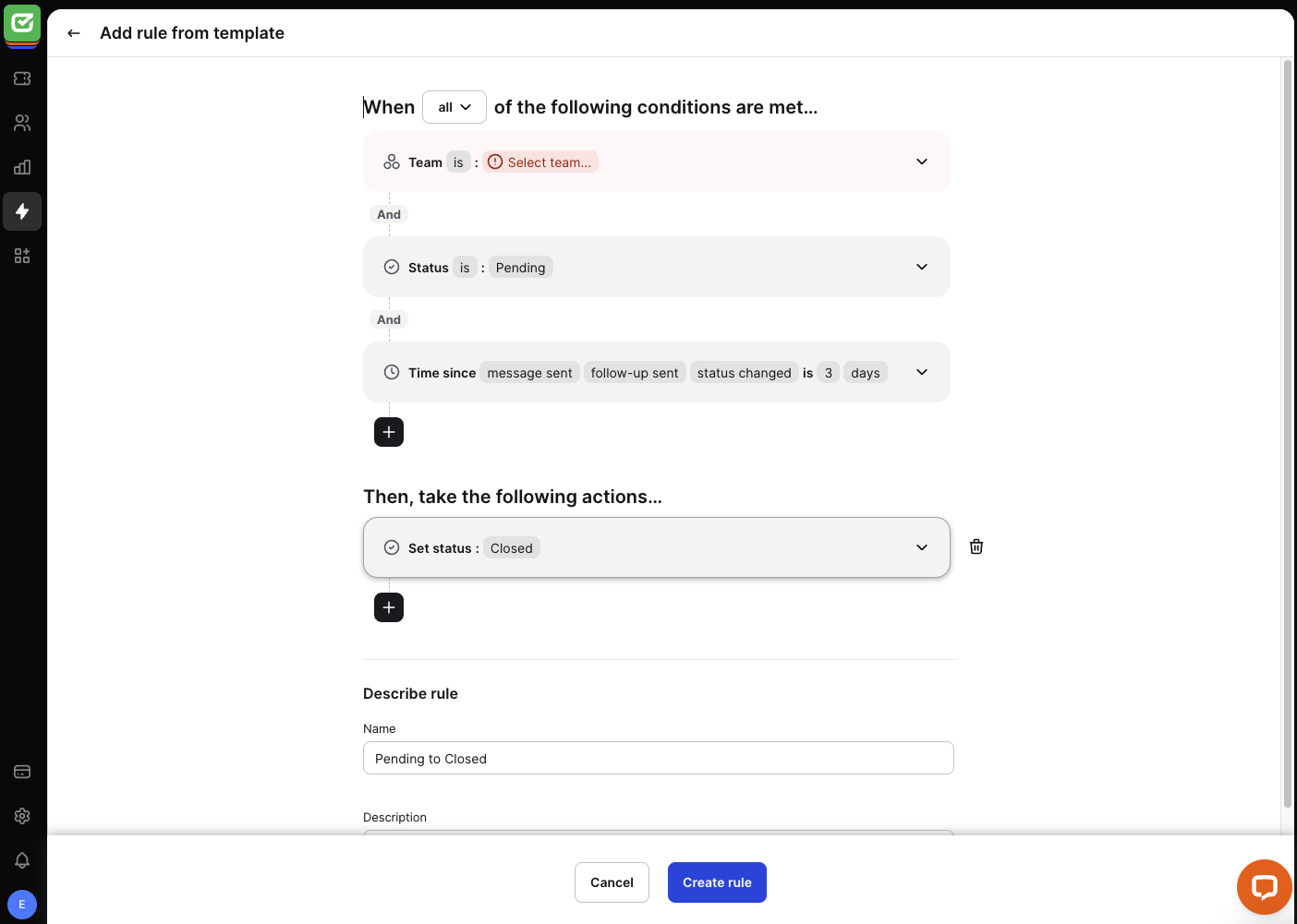 This rule is executed when all conditions are met. Select the team to link it with the rule. The rule is executed when the ticket status is set to “Pending.” Also, when the reported inactivity on the ticket has reached three days.