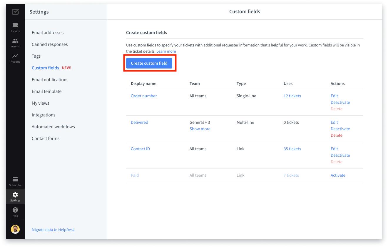 To deactivate your custom field, go to the list of custom fields, find the right custom field, and click the “Deactivate” button. The custom field will be deactivated immediately and it won’t be available in the ticket details.