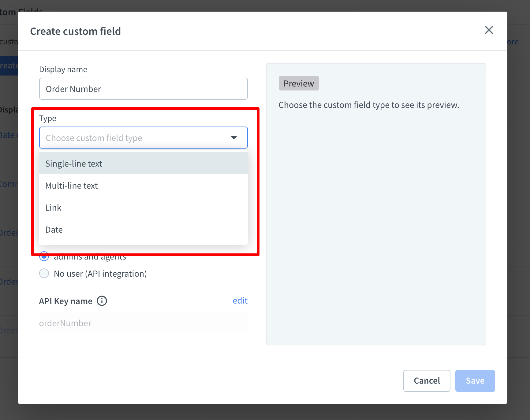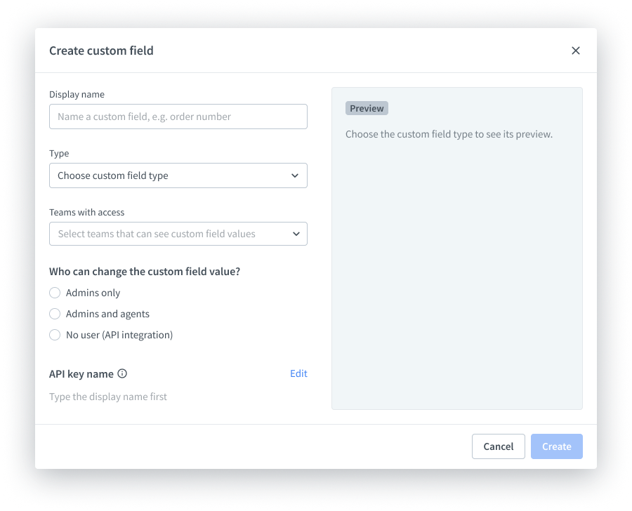 - No one (API integration) — your custom field will be populated with data through a dedicated integration created using the API documentation. As a result, admins and agents won’t be able to edit the values manually.