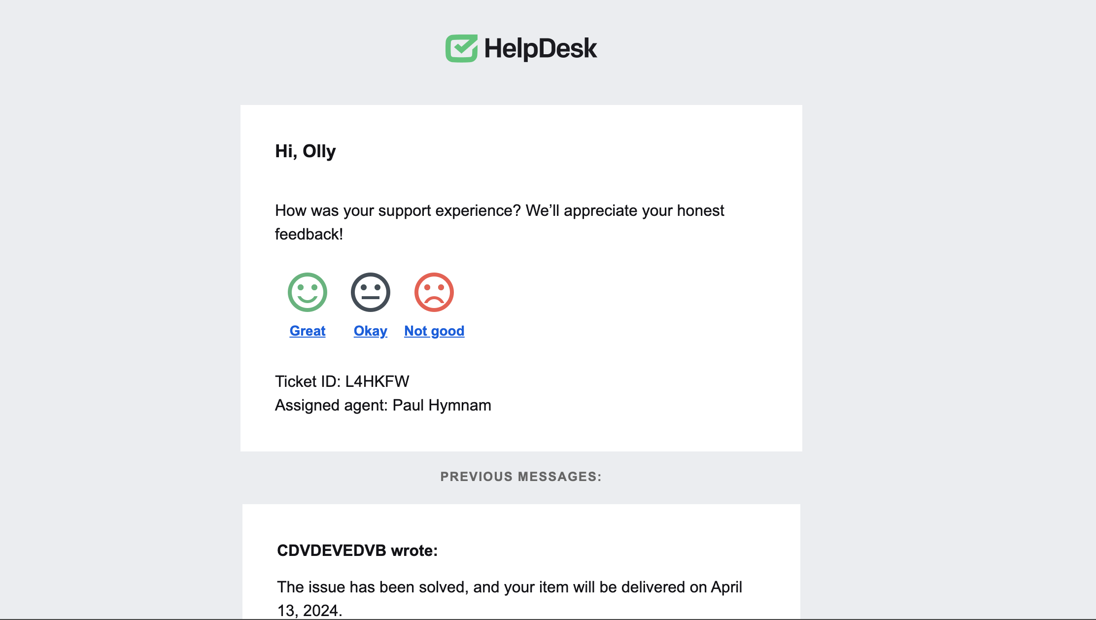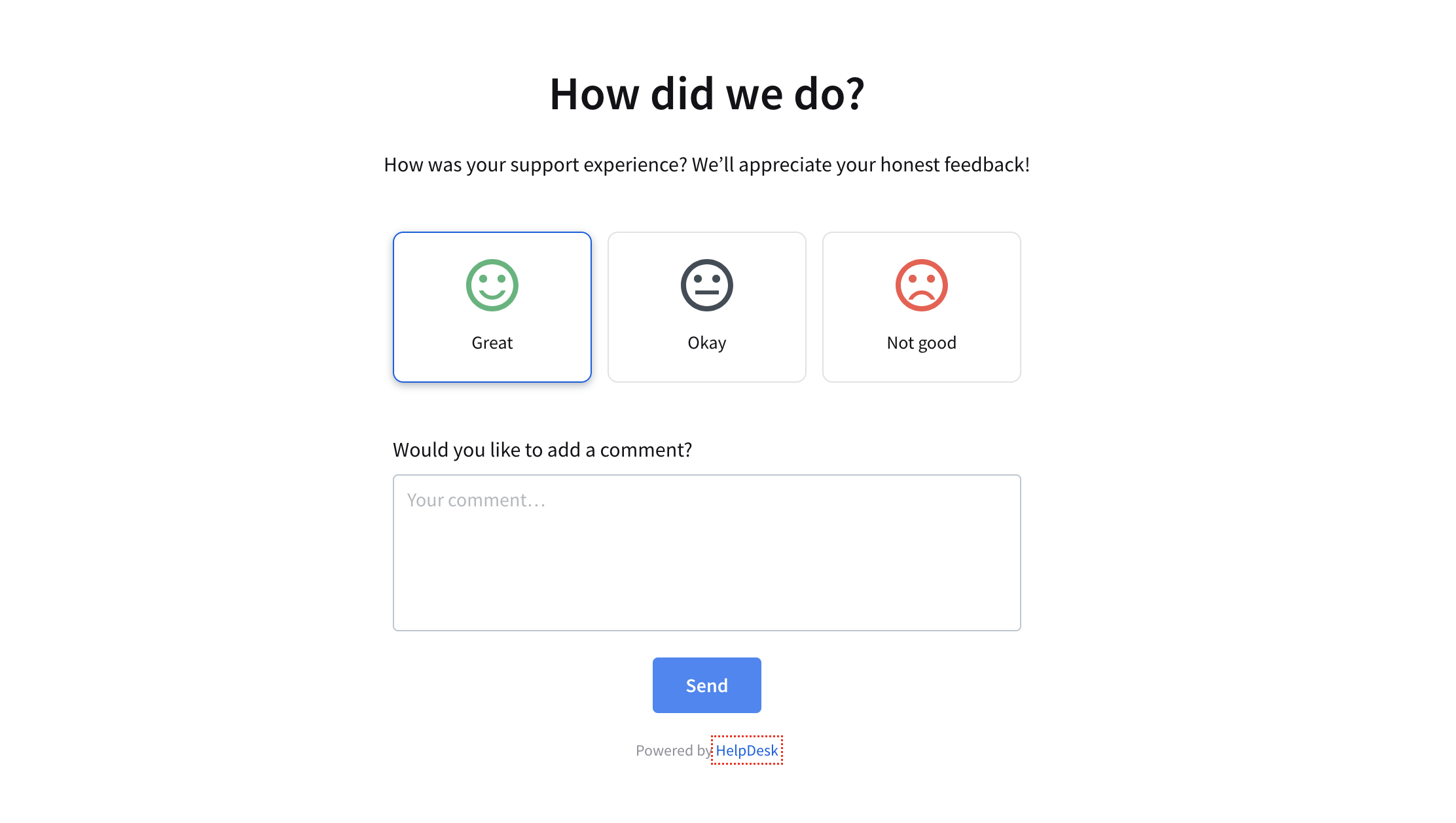 When the recipient picks a rating inside the ticket, it automatically takes them to a dedicated website where the rating they selected is already saved.