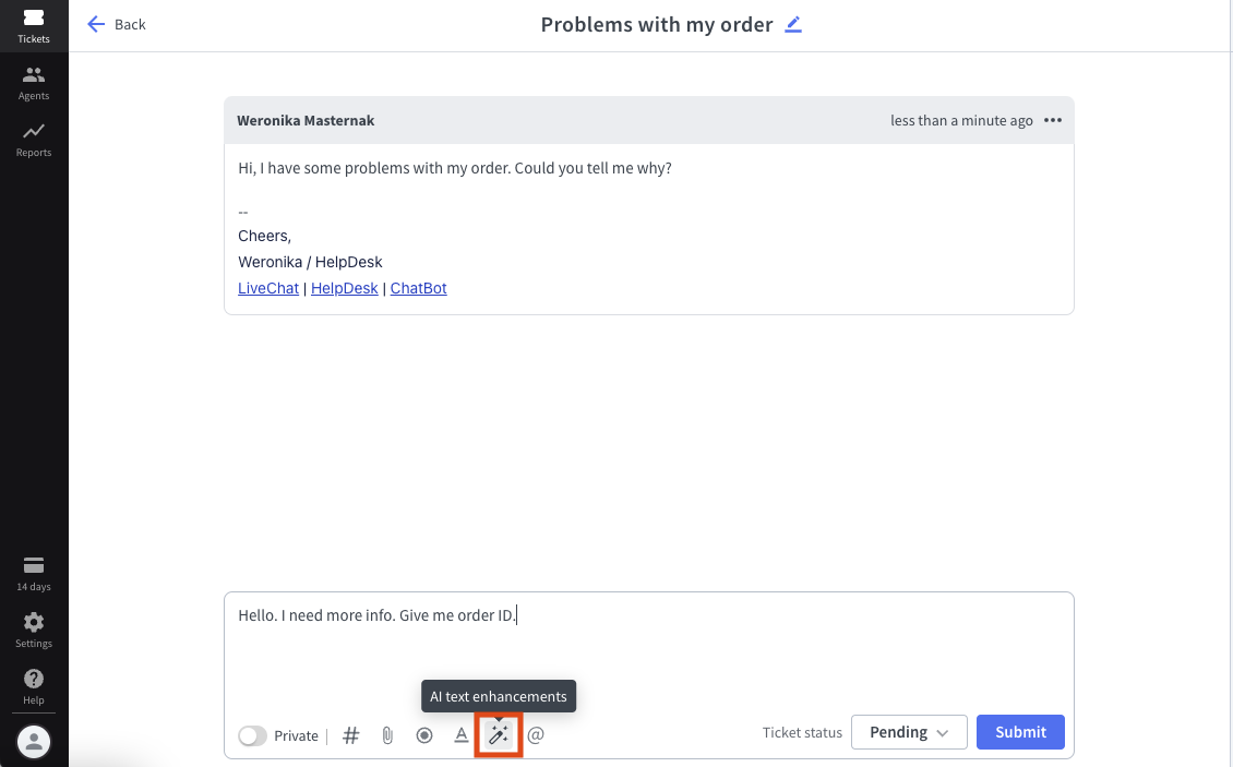 You probably spend almost half of your time on a ticket, using the message area to talk to your recipients. Now you can use AI text enhancements to make the replying process more efficient.