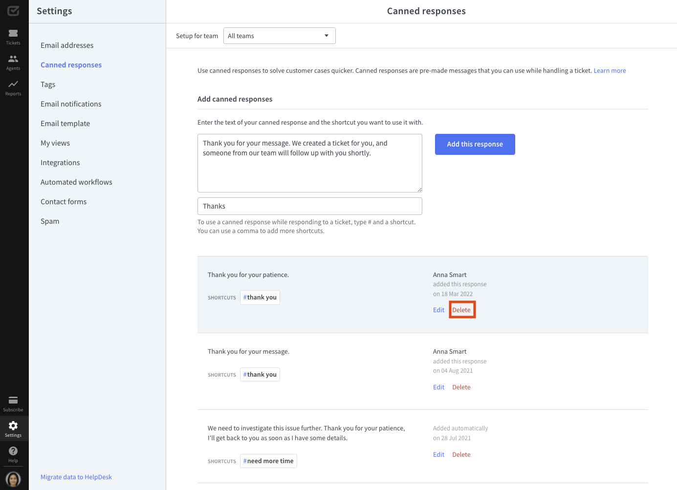 - Go to the “Settings” section, select the “Canned responses” category, and find the response you want to delete.