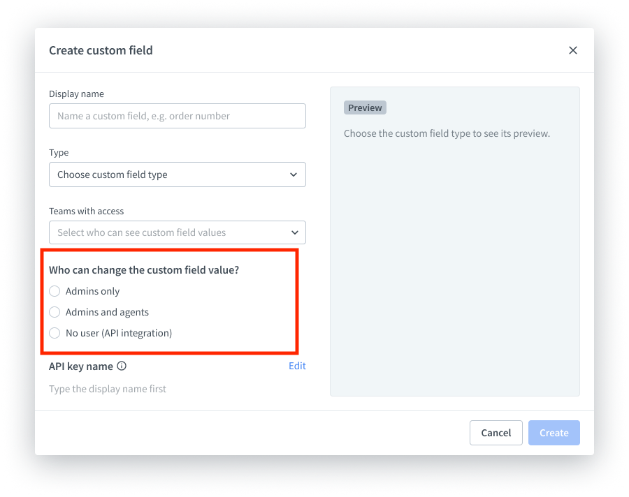 - No one (API integration) — your custom field will be populated with data through a dedicated integration created using the API documentation. As a result, admins and agents won’t be able to edit the values manually.