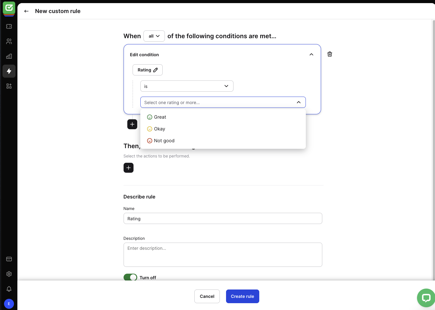 Choose whether a rating is (given in the past) or has been added (given after the automation was created) as Great 🟢, Okay 🔵, or Not good 🔴 in tickets to automate responding to customer feedback.
