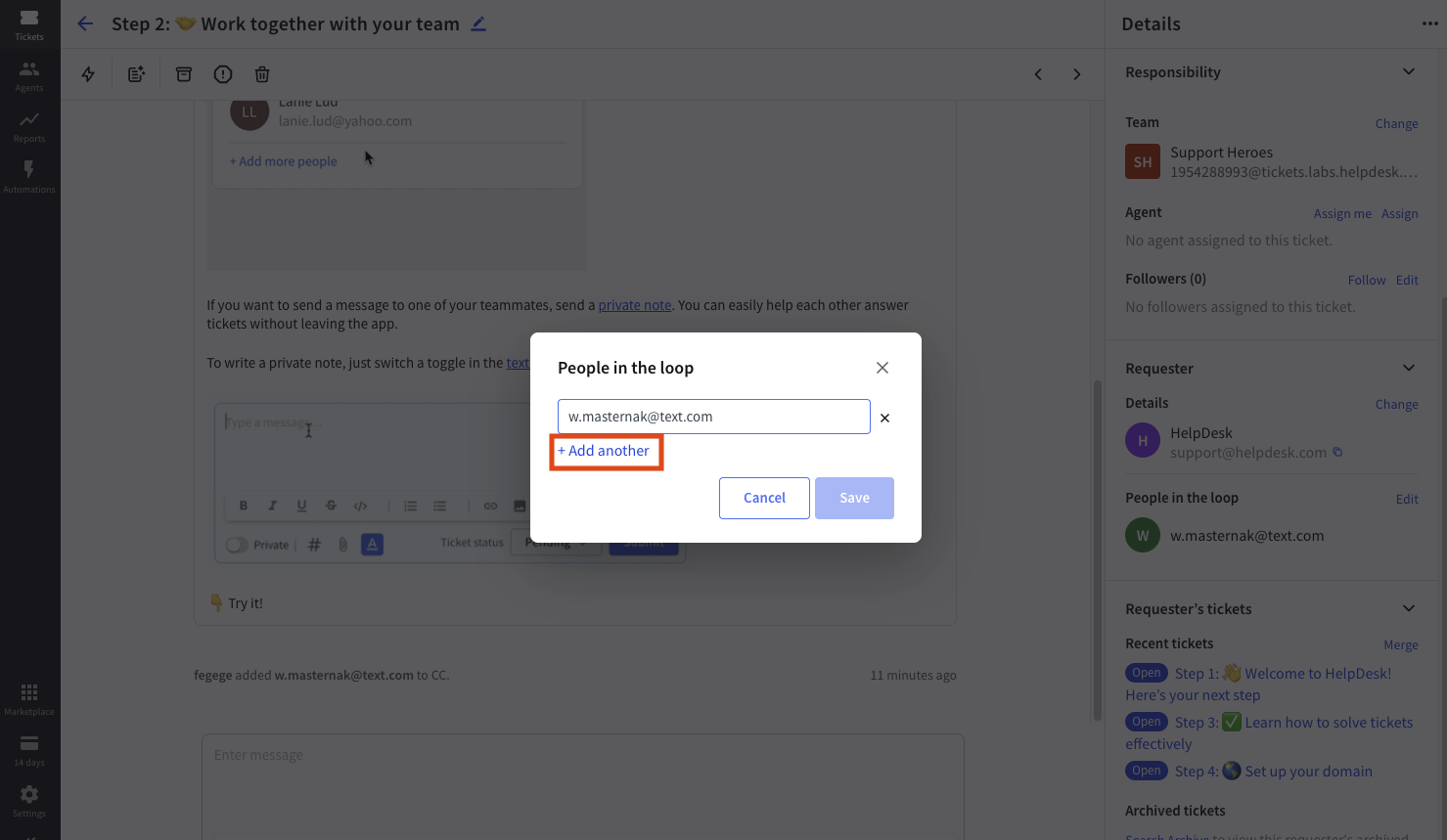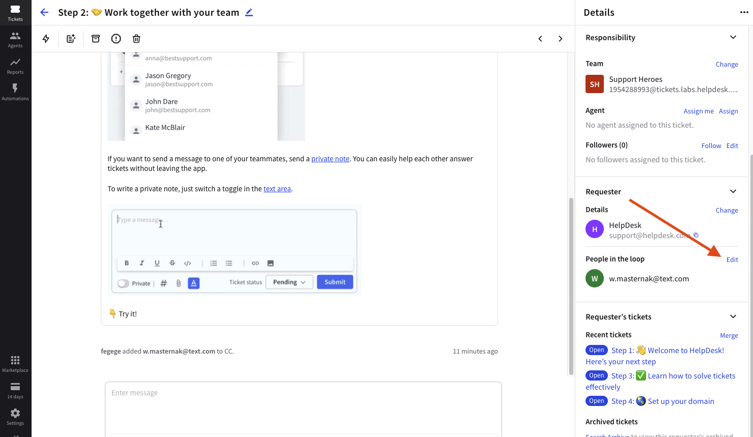 All email addresses added to the “People in the loop” field actively participate in the exchange of messages and can see the content of the entire message. They’re also free to reply to the ticket.